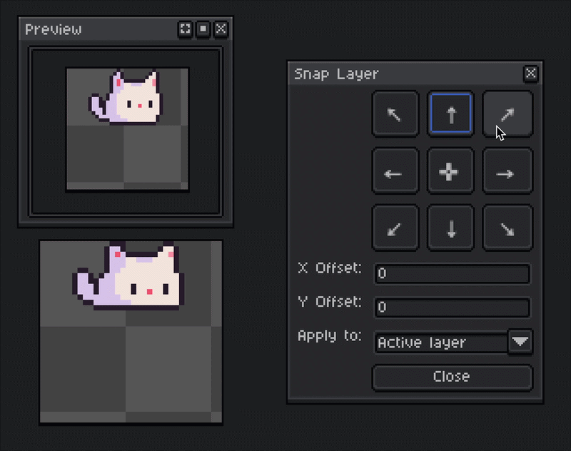 Layer Snapper is a free Aseprite script (plugin) for pixel art alignment. Instantly snap, center, or position any layer's pixel content to 9 points on the canvas: corners, edges, or dead center. No more manually calculating coordinates to align sprites in your game dev workflow.